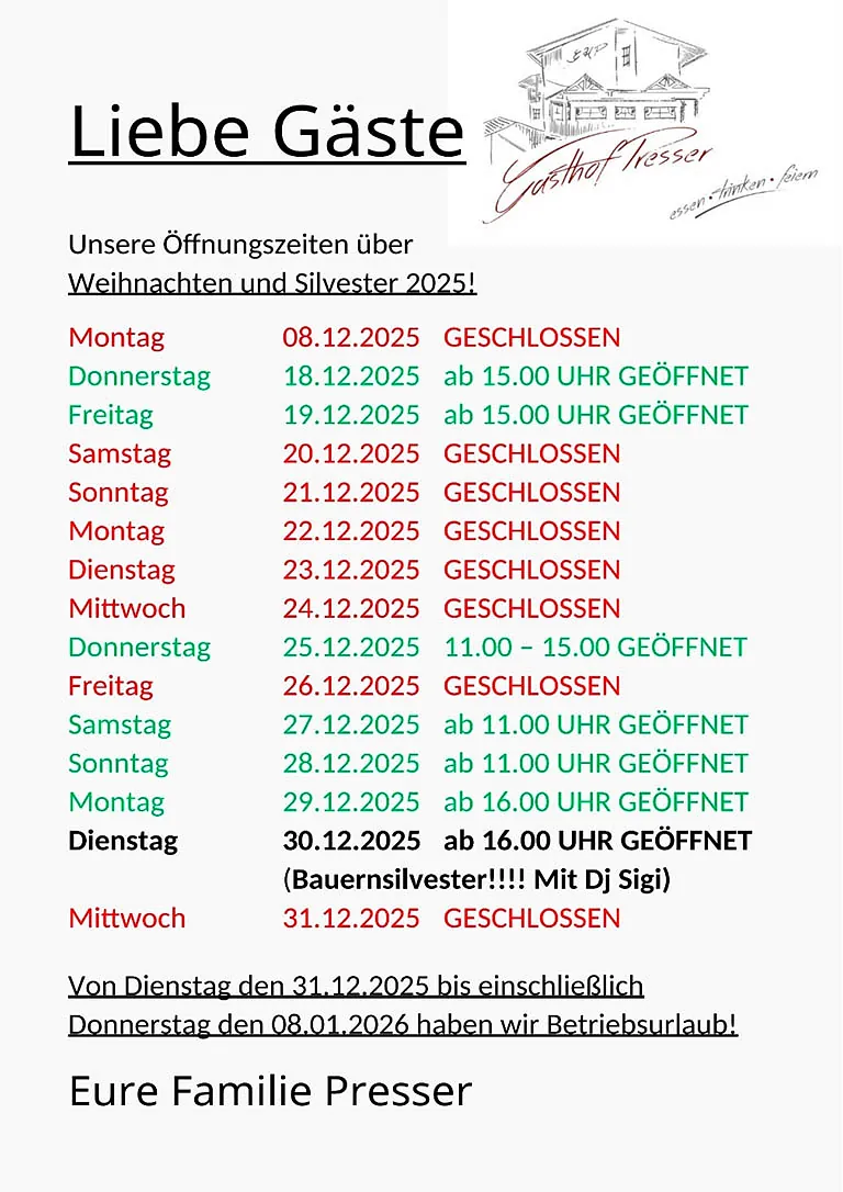 Im Gasthof Presser gibt es immer etwas Neues zu entdecken. Ob Heringssalat, Pizza-Sonntag oder saisonale Festivitäten – werfen Sie einen Blick auf unsere aktuellen Termine und Angebote. Wir freuen uns, Sie bei einem unserer Events willkommen zu heißen. Unser Veranstaltungskalender hält immer wieder Überraschungen bereit, die Ihren Aufenthalt bei uns noch schöner machen. Von kulinarischen Highlights bis hin zu besonderen Aktionen bieten wir Ihnen das ganze Jahr spannende Erlebnisse. Besuchen Sie uns und werfen Sie einen Blick auf unsere aktuellen Termine und Angebote. Wir freuen uns, Sie bei uns willkommen zu heißen. Unser Veranstaltungskalender hält immer wieder Überraschungen bereit, die Ihren Aufenthalt bei uns noch schöner machen.
